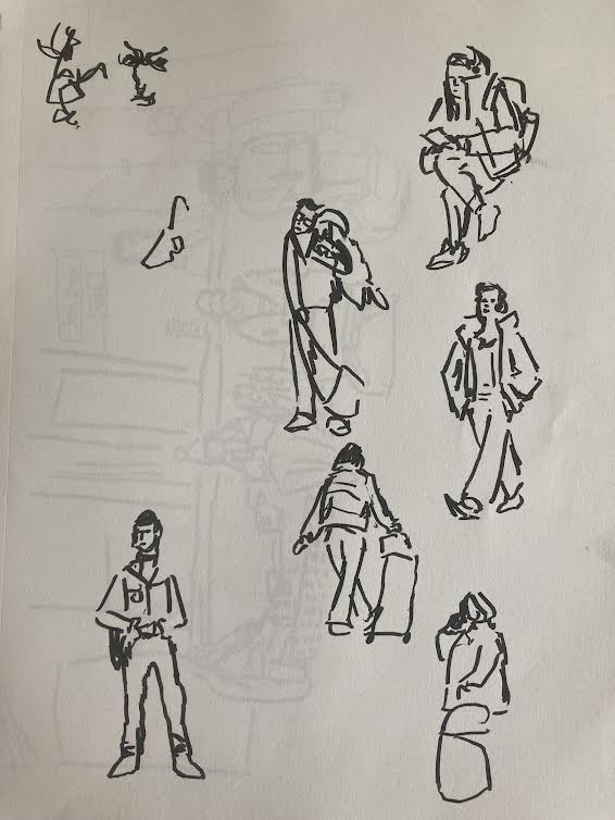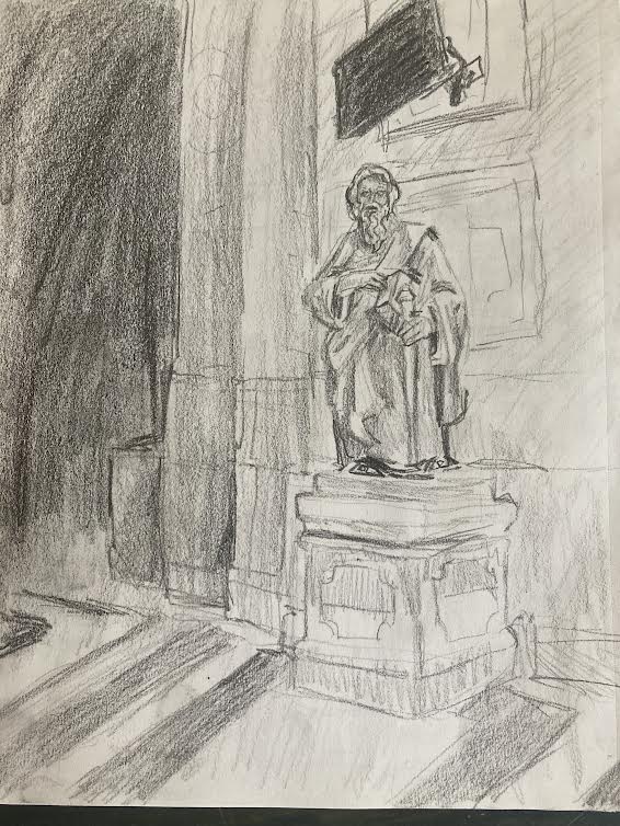 Clearly, on a physical level, I don’t understand churches. I did my sketches avoiding the most detailed parts of the building that were too difficult even to attempt to represent, settling on a view of a statue next to a pillar. The TV screen bolted above the statue provided a nice contrast I thought. I finished my sketch as the class came to an end and the church closed. I regrouped with my classmates and we found a subway back to campus. As I joked with my classmates though, I couldn’t get the way I felt in the church out of my mind. It may not have been the intended reaction but I felt something in those halls.