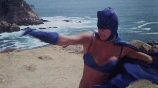 However you see her, the Bat Woman is a brilliant fantasy character. She is a glamorous, independent single woman, who uses her immense wealth to teach herself extraordinary skills and to fight crime, all while outsmarting her two male cop sidekicks. Her wardrobe is spectacular, dripping with mink stoles and dazzling evening gowns, when she’s not in disguise training with the luchadoras at the gym or cruising in her T-Bird along Acapulco’s scenic cliffside roads. The Bat Woman shows no interest in romance, has no traumatic back story, and generally just seems to be having a great time, even if her exploits do sometimes see her getting into fights with mad scientists and fishmen.