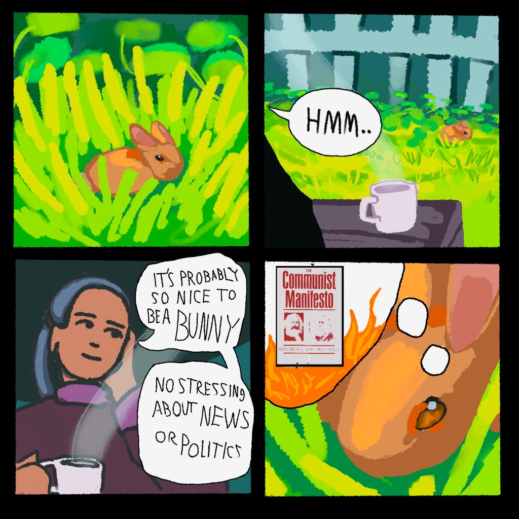 art Magpies’ Comic Section: Nice to be a Bunny By Magpies on July 7, 2025 • ( Leave a comment ) Nice to be a Bunny By Isaac Adas Share this: Click to share on X (Opens in new window) X Click to share on Facebook (Opens in new window) Facebook Like Loading... Related Categories: art, comic, featured, humor Tagged as: art, bunny, comic, featured