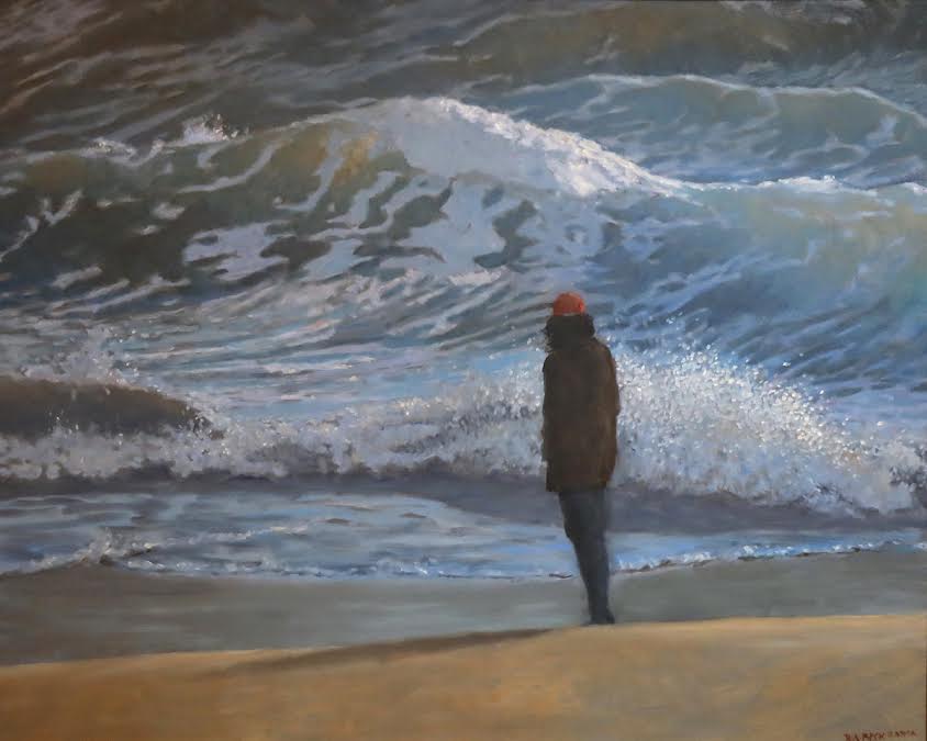 This perspective puts the painting’s viewer at a distance, emphasizing the size and might of the surf and leaving the figure alone in her contemplation. The woman was a decision I made after the rest of the painting was in place. I wanted a heartbeat. Not someone fishing, walking, or playing. No blankets or umbrellas. A person, bundled against the strength of the sea.