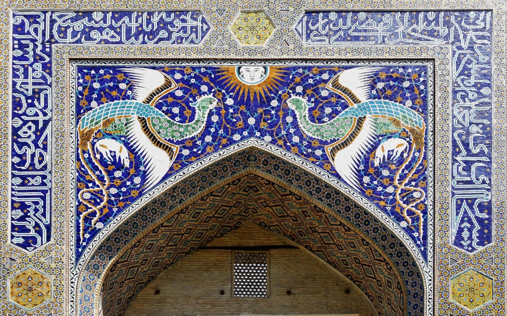 The Simurgh is a mythical healing bird from Persia. It is sometimes compared to the Phoenix from Greek mythology or understood as the “collective consciousness”. A much revered bird, originally a raptor, falcon, eagle or sparrowhawk, the word literally means ‘30 birds’ in Persian. Usually depicted as a winged creature in bird shape who can carry off an elephant. The Simurgh is depicted as a peacock with the head of a dog, claws of a lion and sometimes with the face of a human. The bird is female and purifies the land and water and symbolizes the unity between the Earth and Sky. The simurgh is mentioned in Sufi poetry, the Shahnameh, and found on Umayyad coinage. The khanakah of Nadir Divan-Begi (17th century) from Bukhara was a centre for Sufi meetings. The entrance arch shows the Simurgh and the Celestial Sun as in the moment of spiritual illumination as mentioned in the Mantiq-al-tair. In recent times it is a central figure in the Coat of Arms of Uzbekistan and on the flag of the Tat people presently living in Azerbaijan, Georgia and Russia.