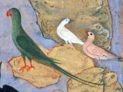 Another illustrated Manuscript (63.210, folio 11r) of the Mantiq at The Metropolitan Museum of Art, New York has an image of the birds gathered in an idyllic place. The birds have been separately enlarged for better viewing and clarity. One can see the peacock, the hoopoe, the eagle and ducks among others. The painting is opaque water- colour, gold and silver on paper, by artist Habibullah of Sava who was active between 1590 and 1610 A.D.