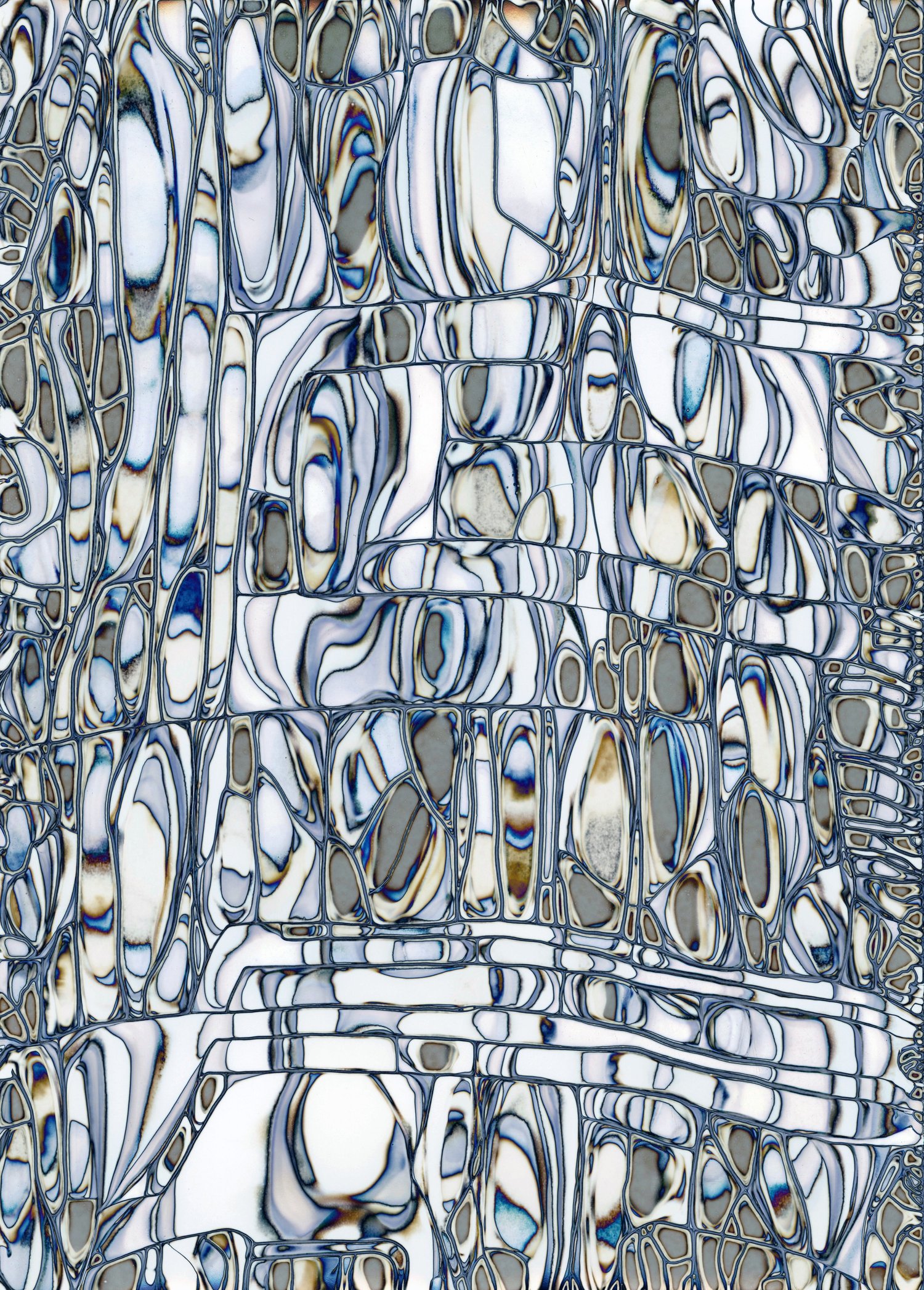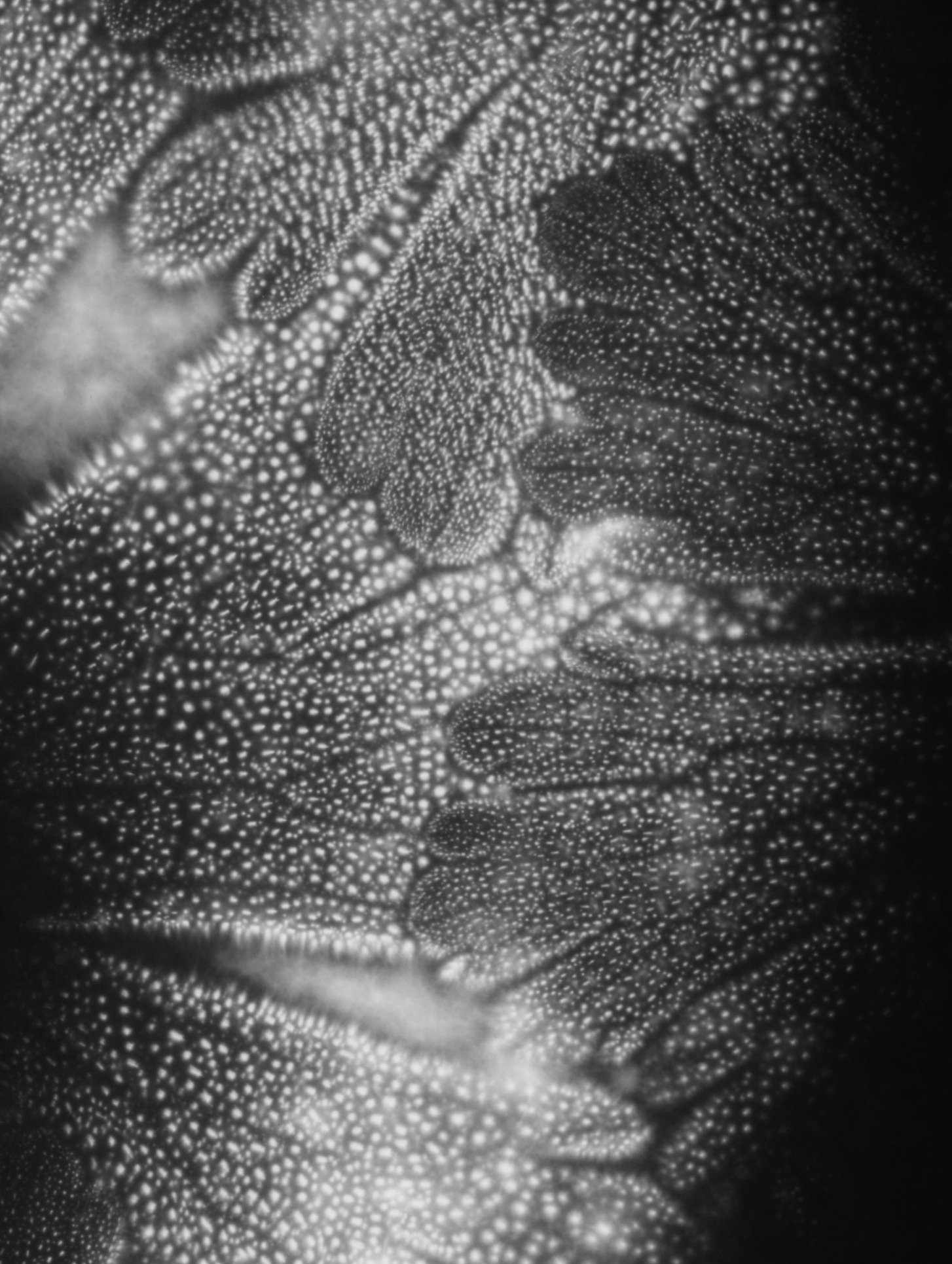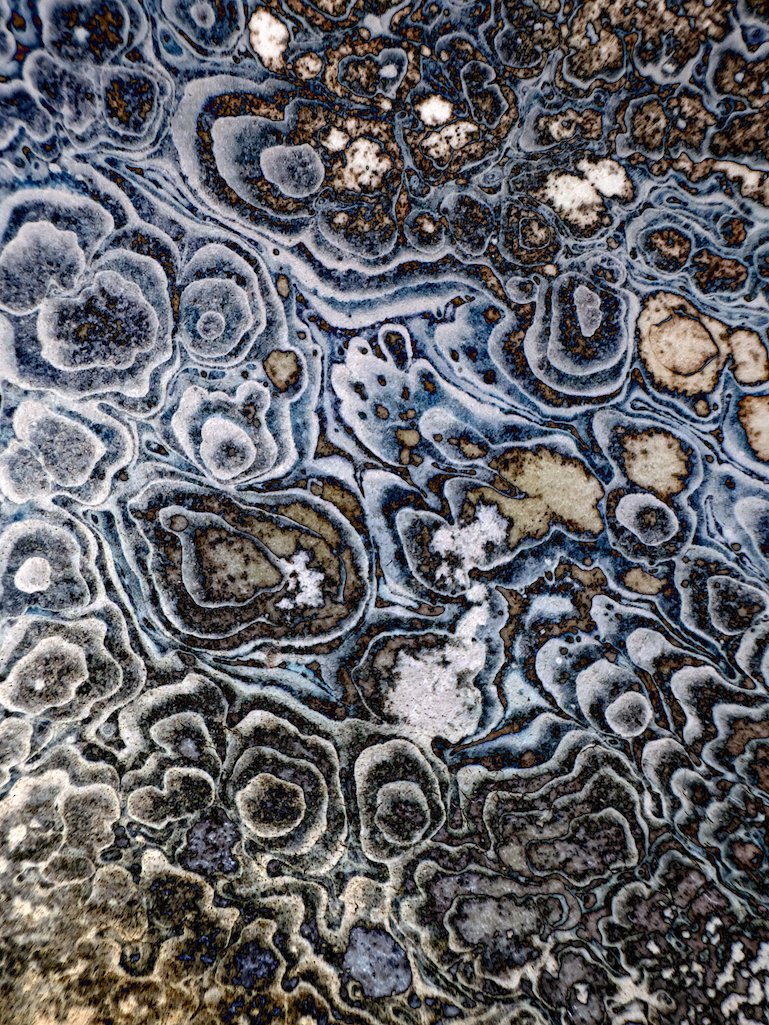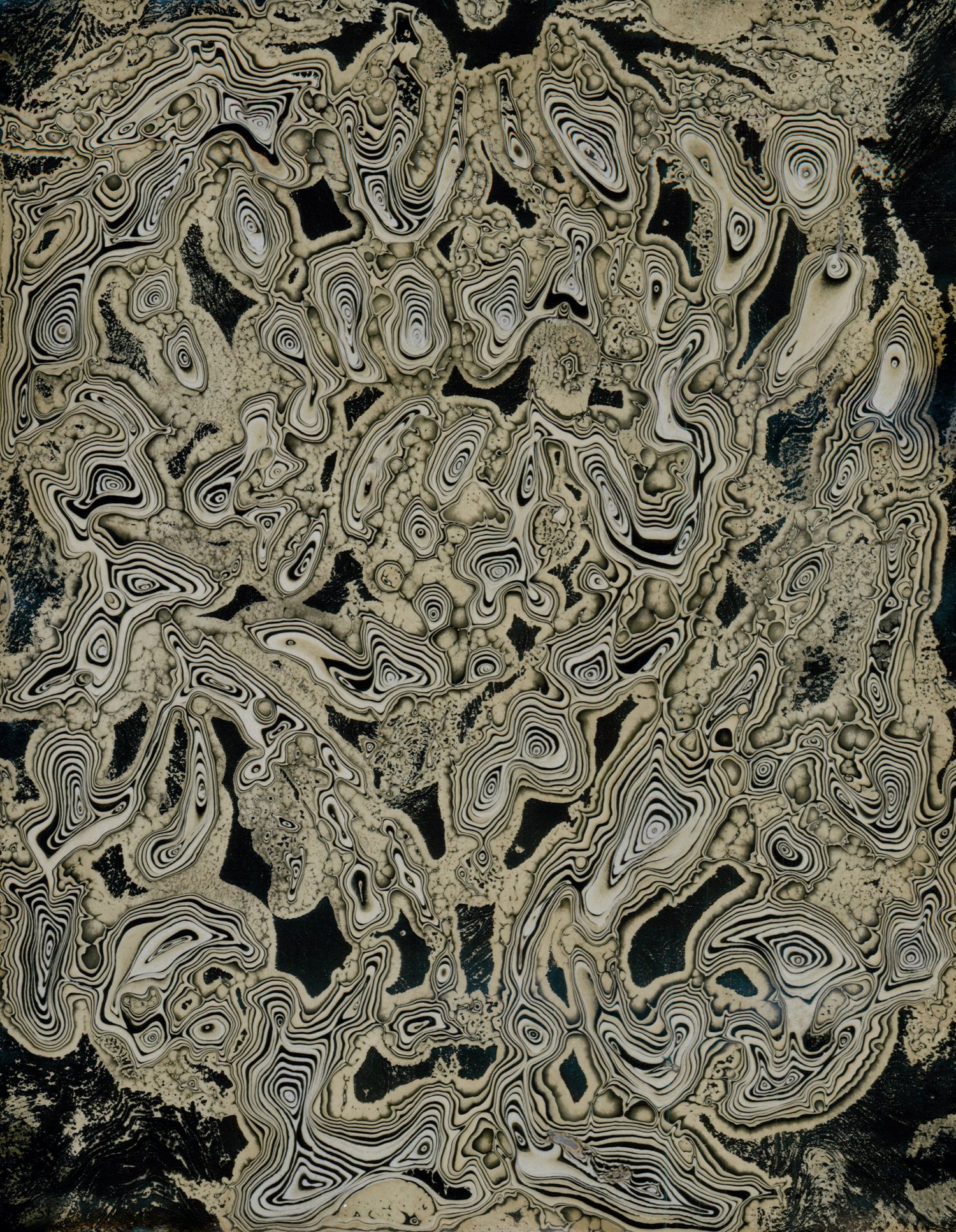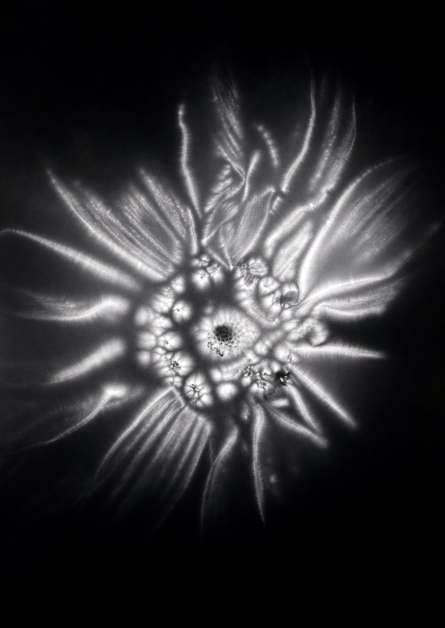 I am usually alone when I work, though not always in the dark. However, whether I’m working with chemigrams, or lumen prints, or in the darkroom, I’m immersed in a dialogue with the materials and matter around me. I see the process as a collaboration with light, chemistry, and time. Often, a microcosm of the earth’s surface and structure will emerge, with shapes and forms resembling vast geological formations, branching patterns, jagged edges, that look strikingly similar to mountain ranges, river systems, striations on a shell or weathered stone. Science tells us this resemblance is not merely coincidental — it reflects shared principles of growth, erosion and pattern formation found throughout nature. The process of making a chemigram is shaped by the same forces that sculpt mountains and curve valleys, and those same physical rules that guide the formation of an image can, under different conditions and timescales, govern the evolution of entire landscapes. I find that fascinating!