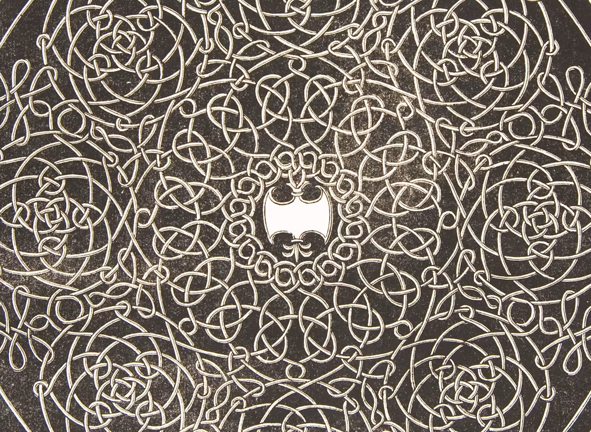 Each knot is in fact a group of intricately entwined infinity loops made up of repeating patterns that follow circular paths. Four smaller, single loops of roughly triangular formation frame each of the knots, effectively squaring the circles with the rectilinear sheets of paper on which they are printed. In the Leonardo engravings, these smaller, “framing” knots are detached; Dürer, however, enclosed the central knots and the peripheral ones within continuous, dark backgrounds.