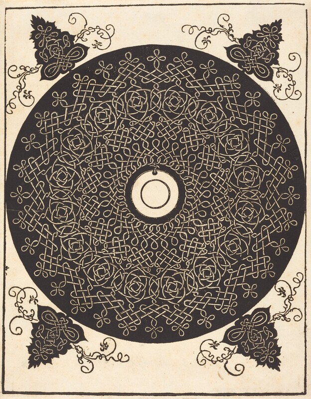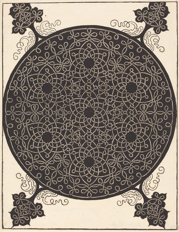 In Peter Cornell’s 1987 novel, The Ways of Paradise: Selected Notes from a Lost Manuscript, the elusive, unnamed scholar-protagonist writes, “Leonardo da Vinci’s and Dürer’s labyrinthine knots without beginning or end can be seen as maps of the universe.” The knots he references are six compositions originally created as engravings attributed to a similarly mysterious “Academy of Leonardo da Vinci” and later translated into woodcuts by the much better documented Albrecht Dürer (1471–1528). Cornell’s scholar is obsessed with epistemological systems, and in his random (or not?) array of notes, one can discern a desire to unify disparate ordering schemes of human invention. Freud, etymology, and pilgrimages are among his fixations. The knots, each a contained, regulated infinitum, are drawn into the scholar’s web of discrete knowledge systems.
