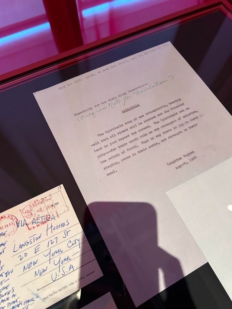 In a back wing of the exhibit, there were long glass display cases filled with Ailey’s notebooks and letters. Ailey had a wide circle of collaborators and influences, including Judith Jamison, Nelson Mandela, Hart Crane, Katherine Dunham, and James Agee. Postcards and journal pages revealed the breadth of his correspondence and reading.