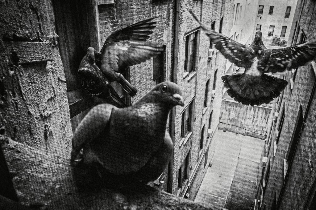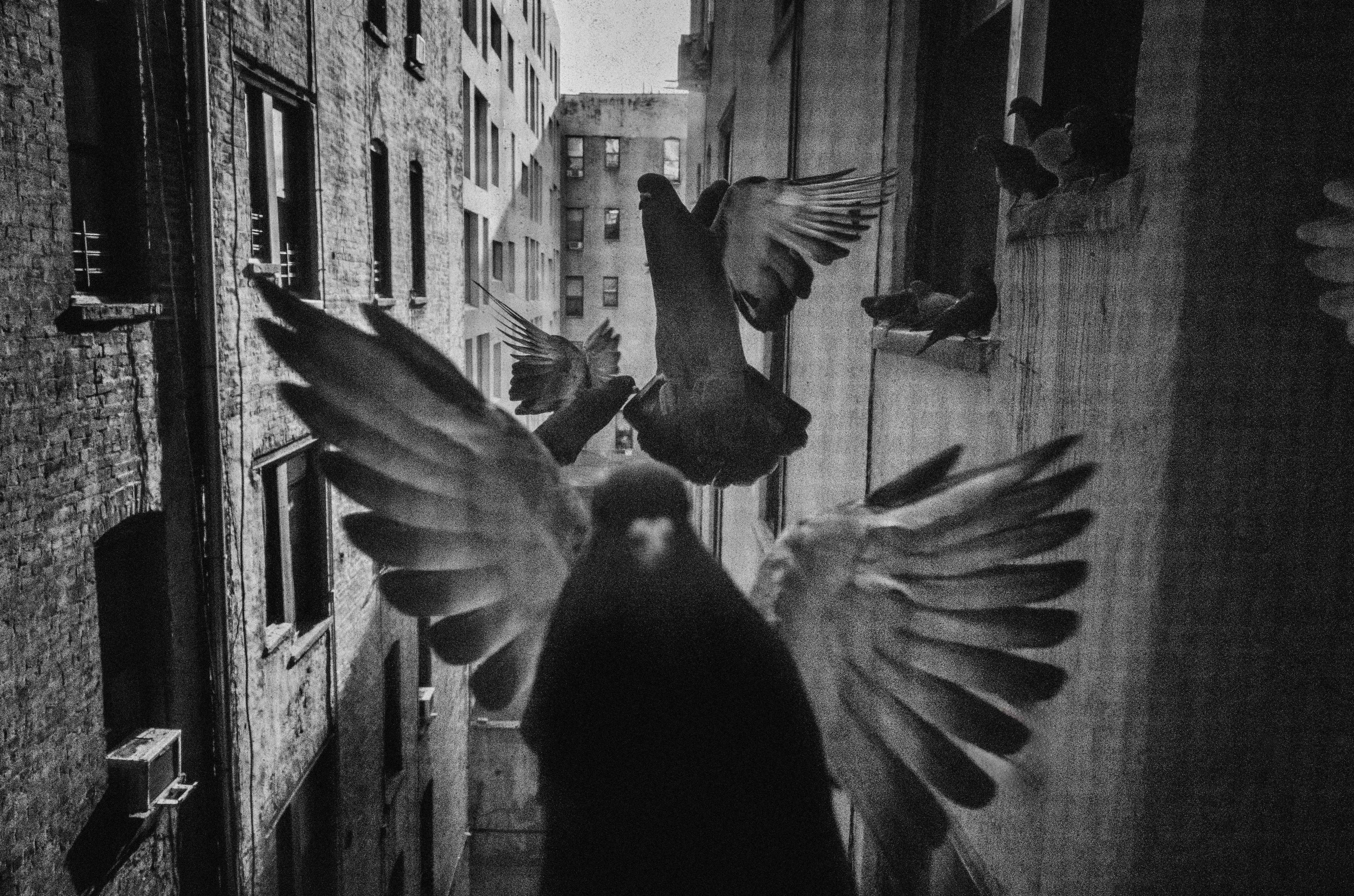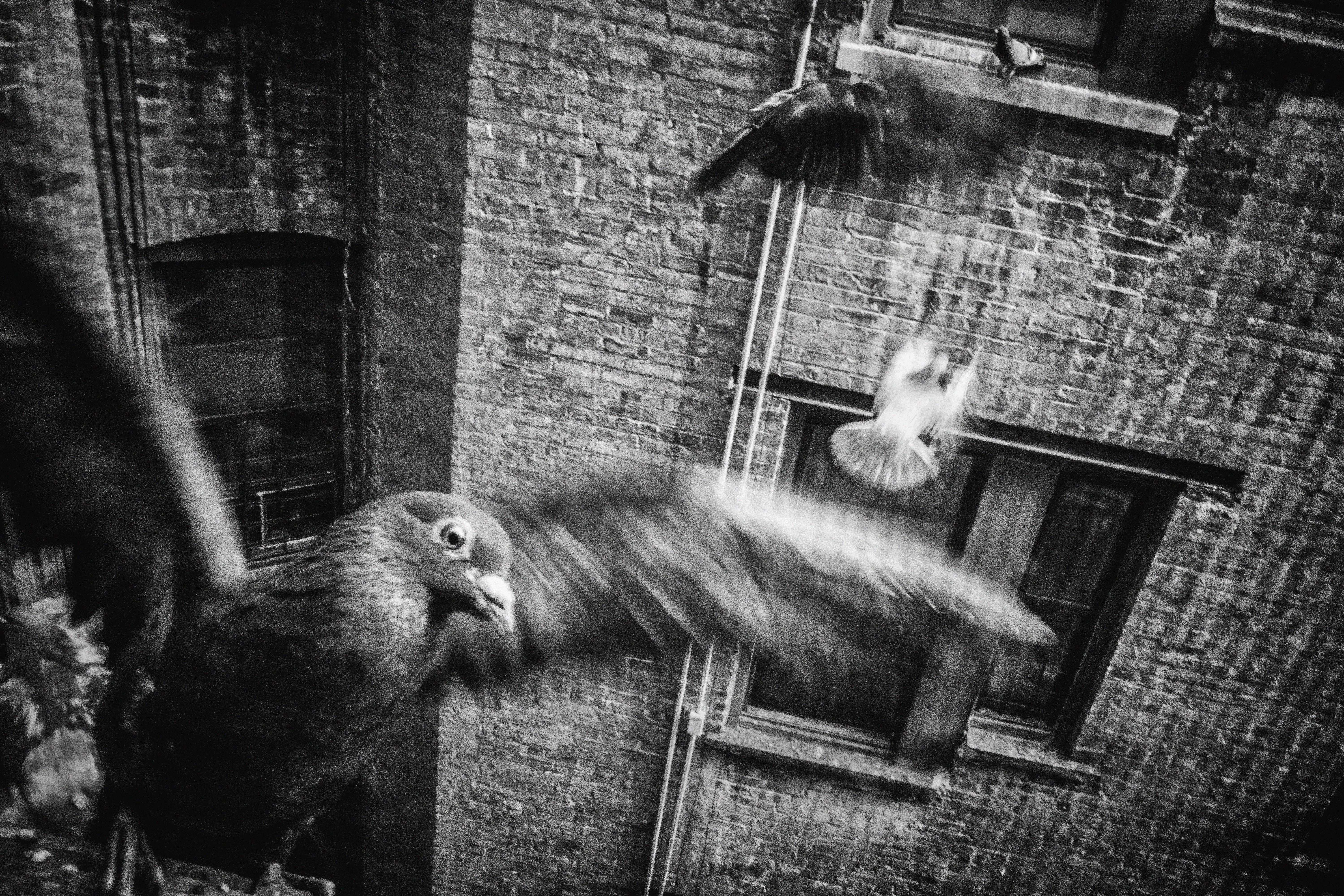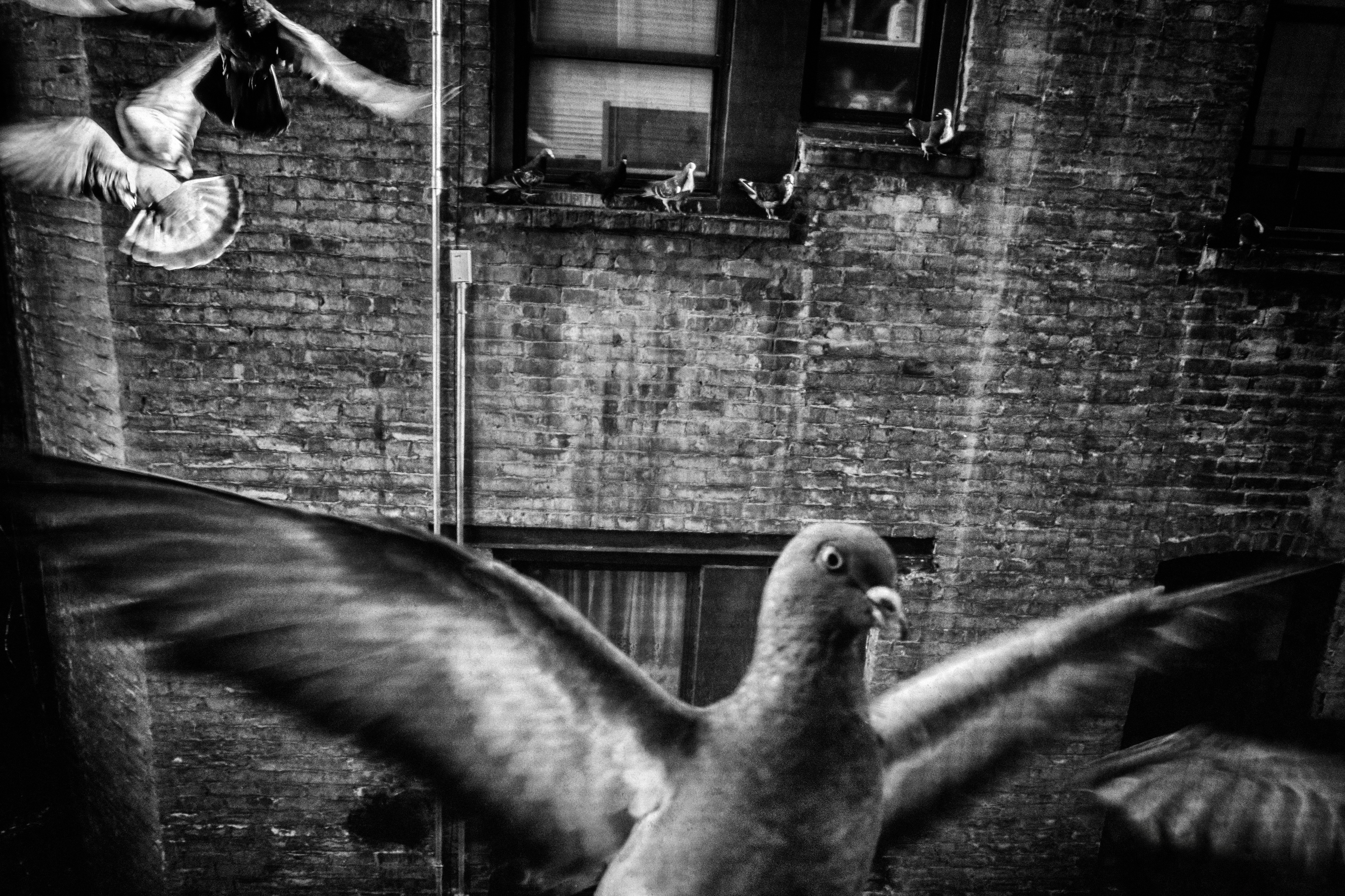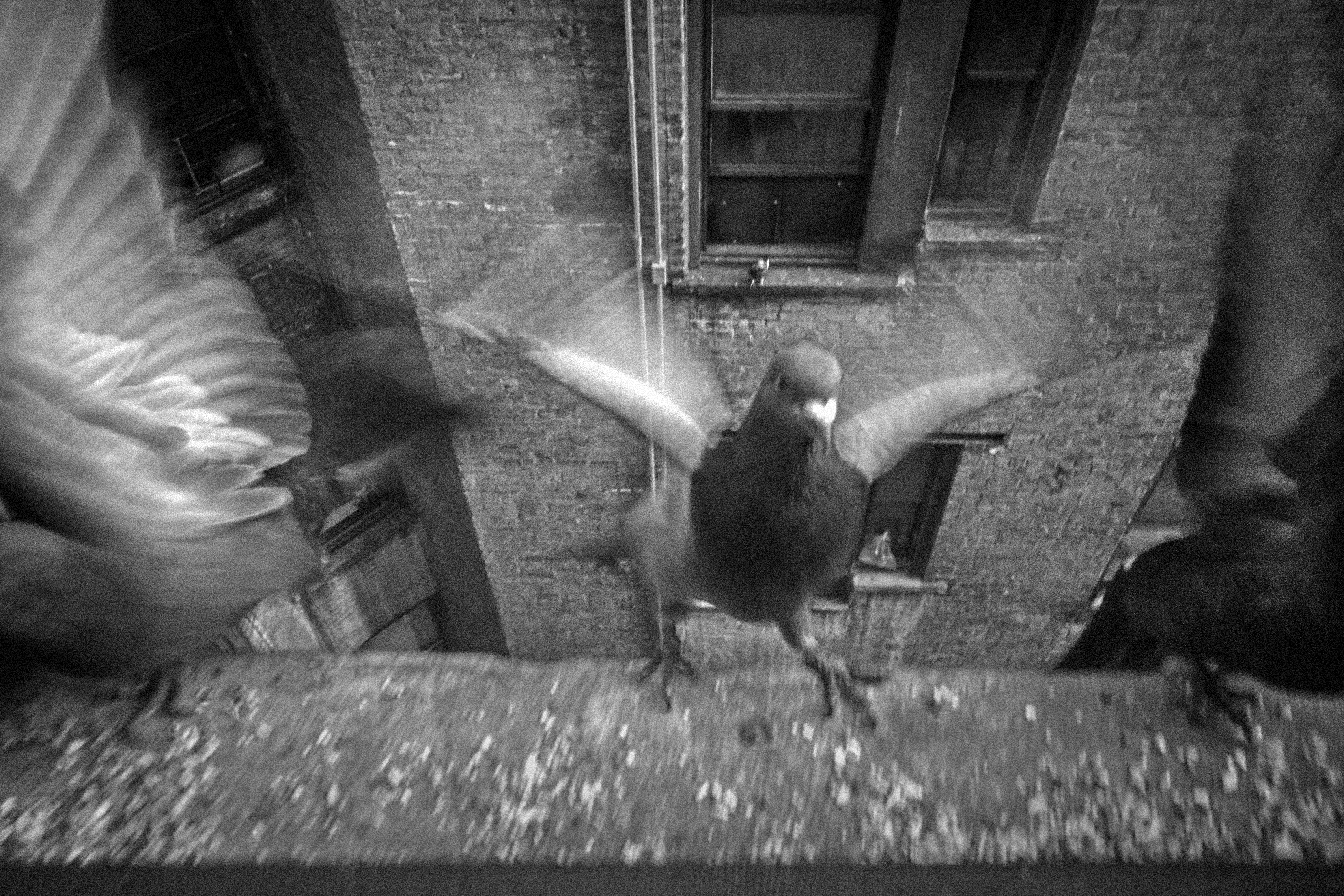 Within a few months, during the morning feeding time, as many as twenty-five pigeons would be flapping and landing in the alley, filling it with a fluttering chaos of feathers, soft wings brushing against one another, claws tapping on the windowsills, beaks pecking greedily at the scattered seed.