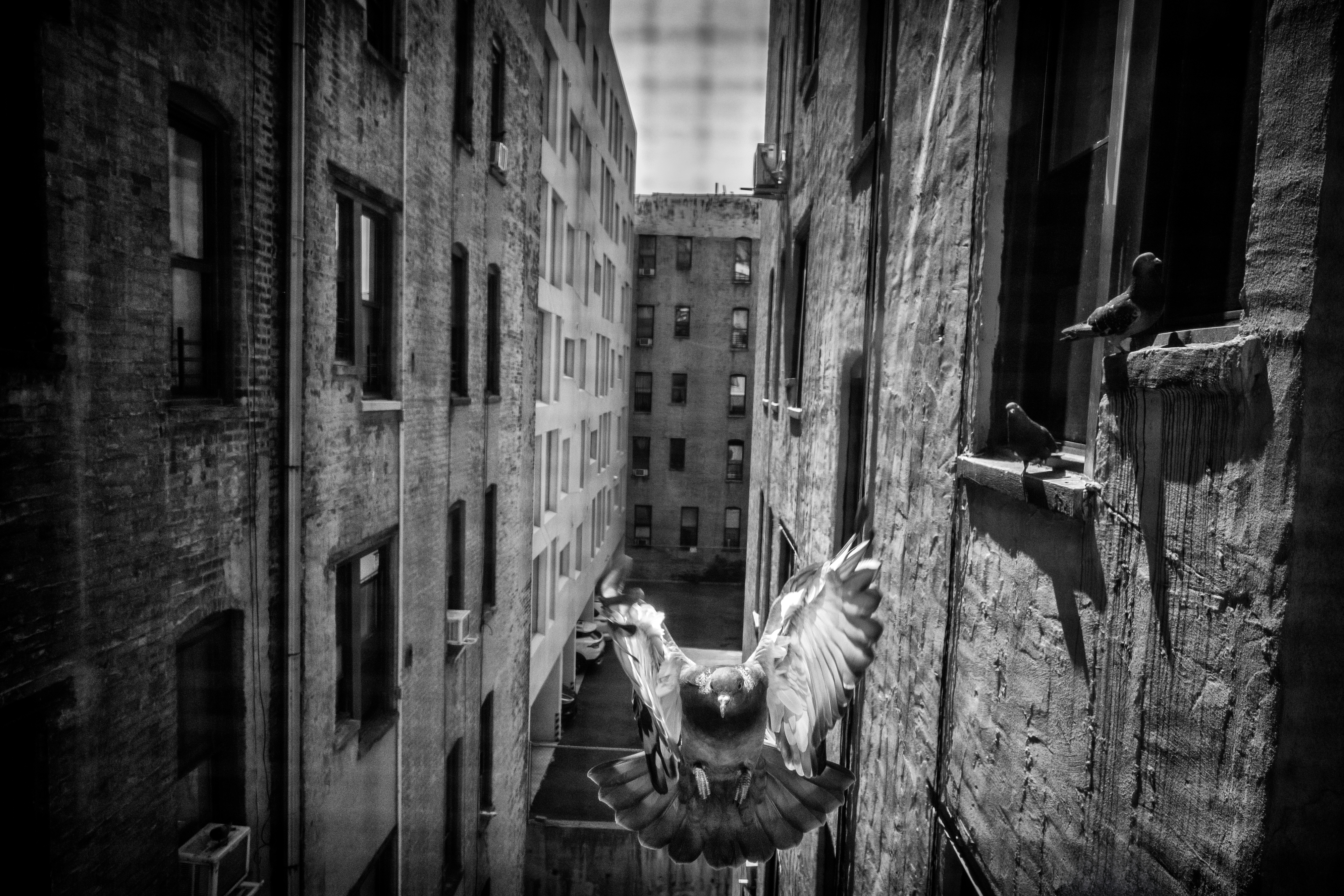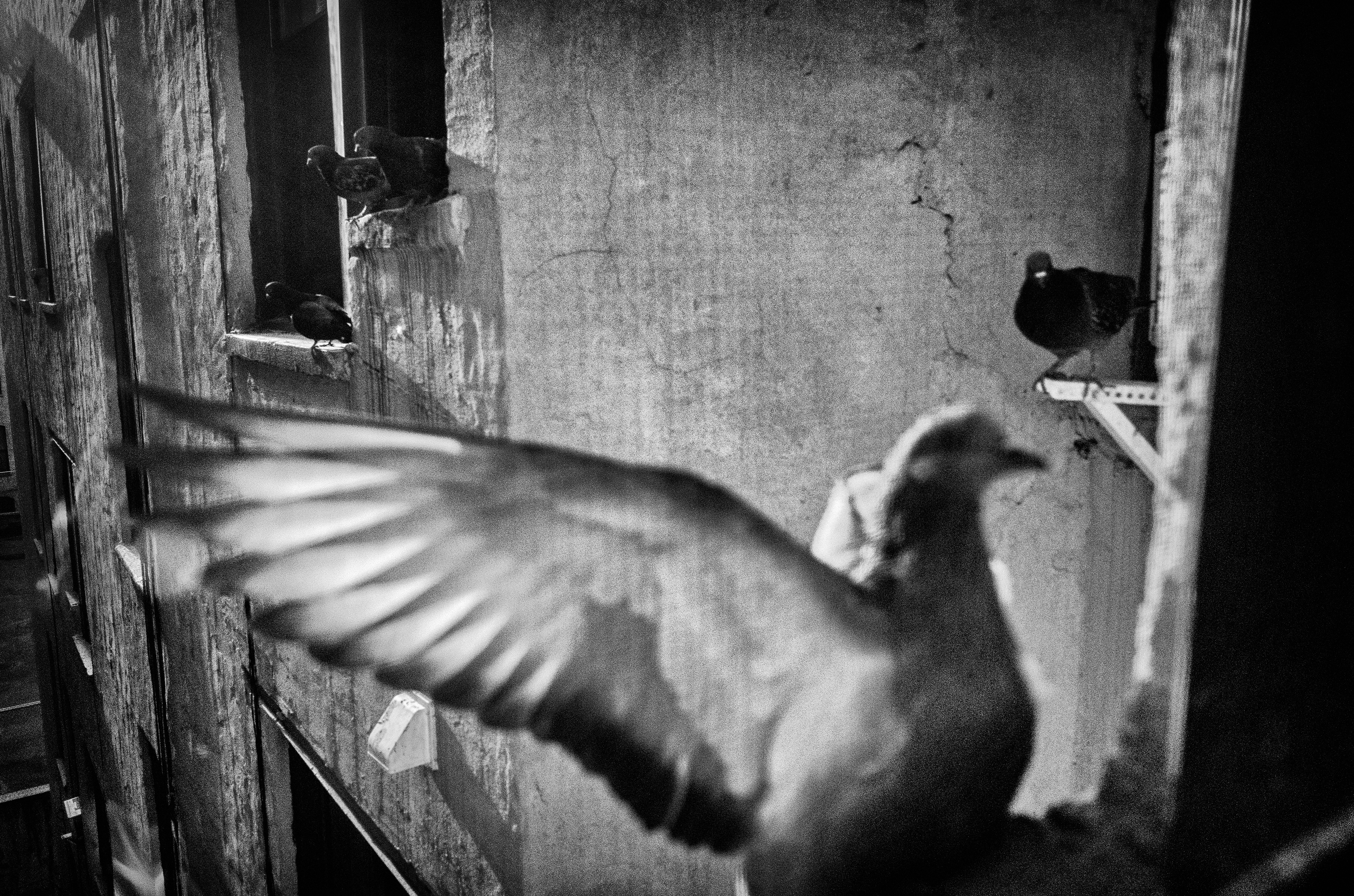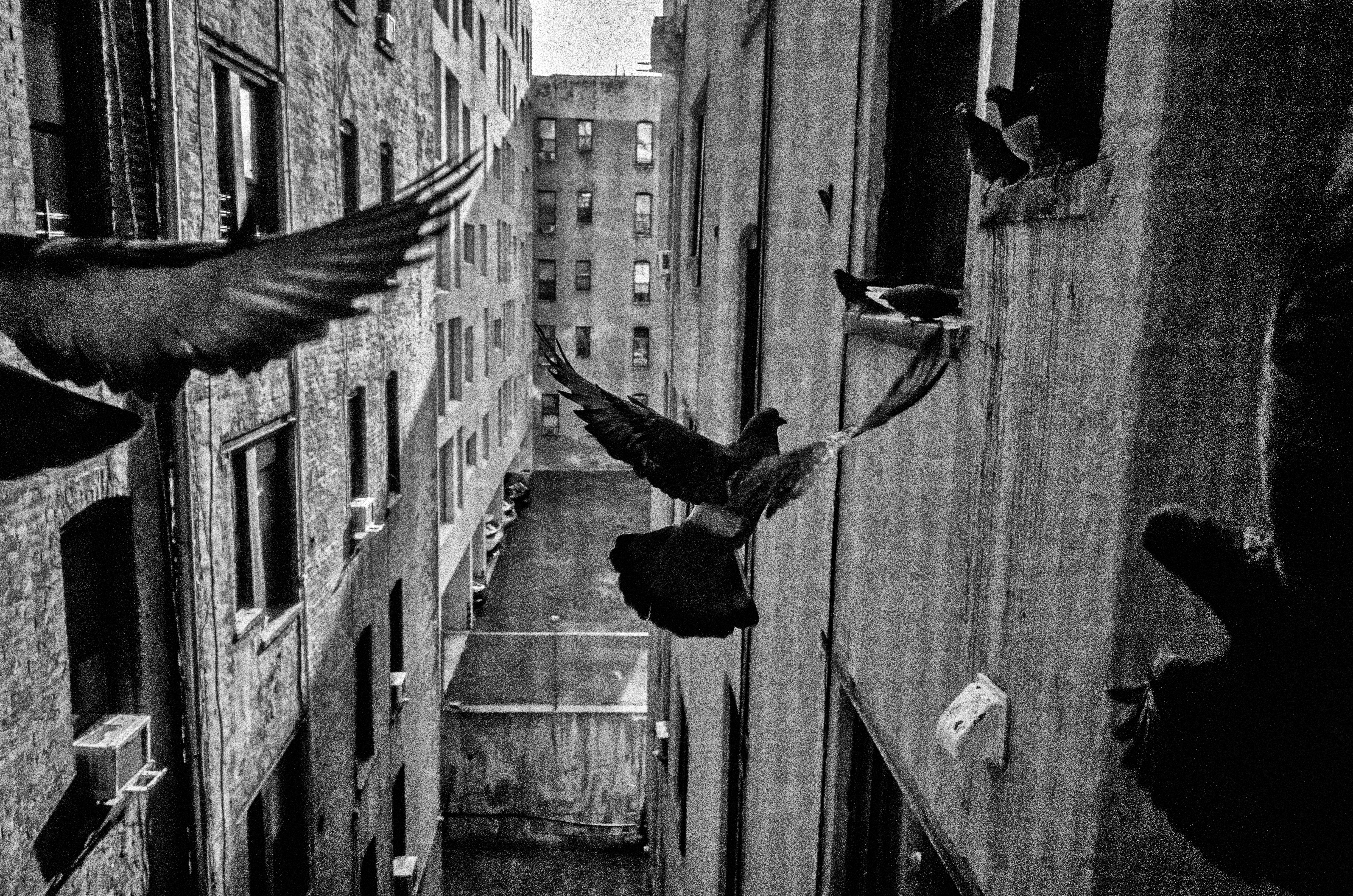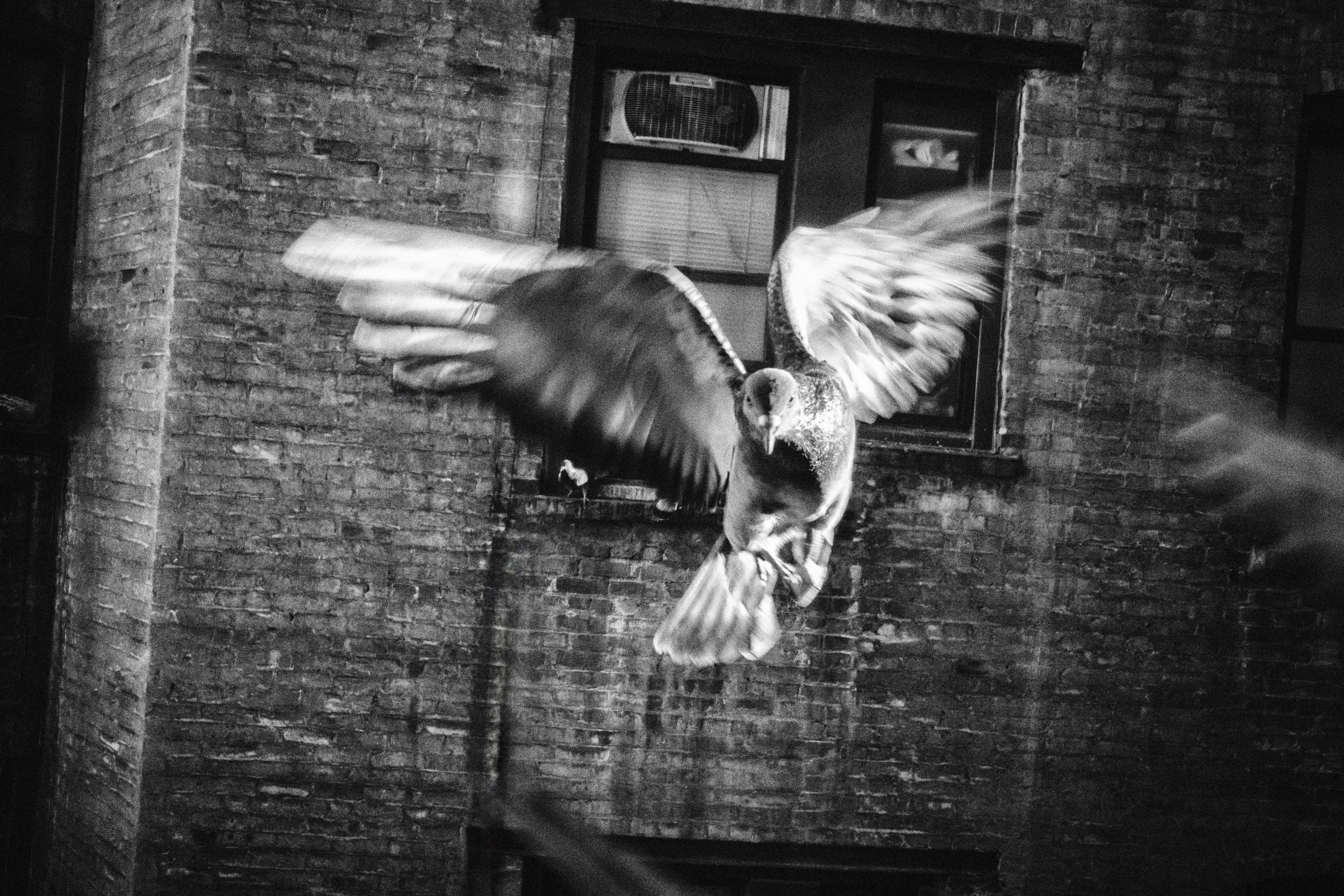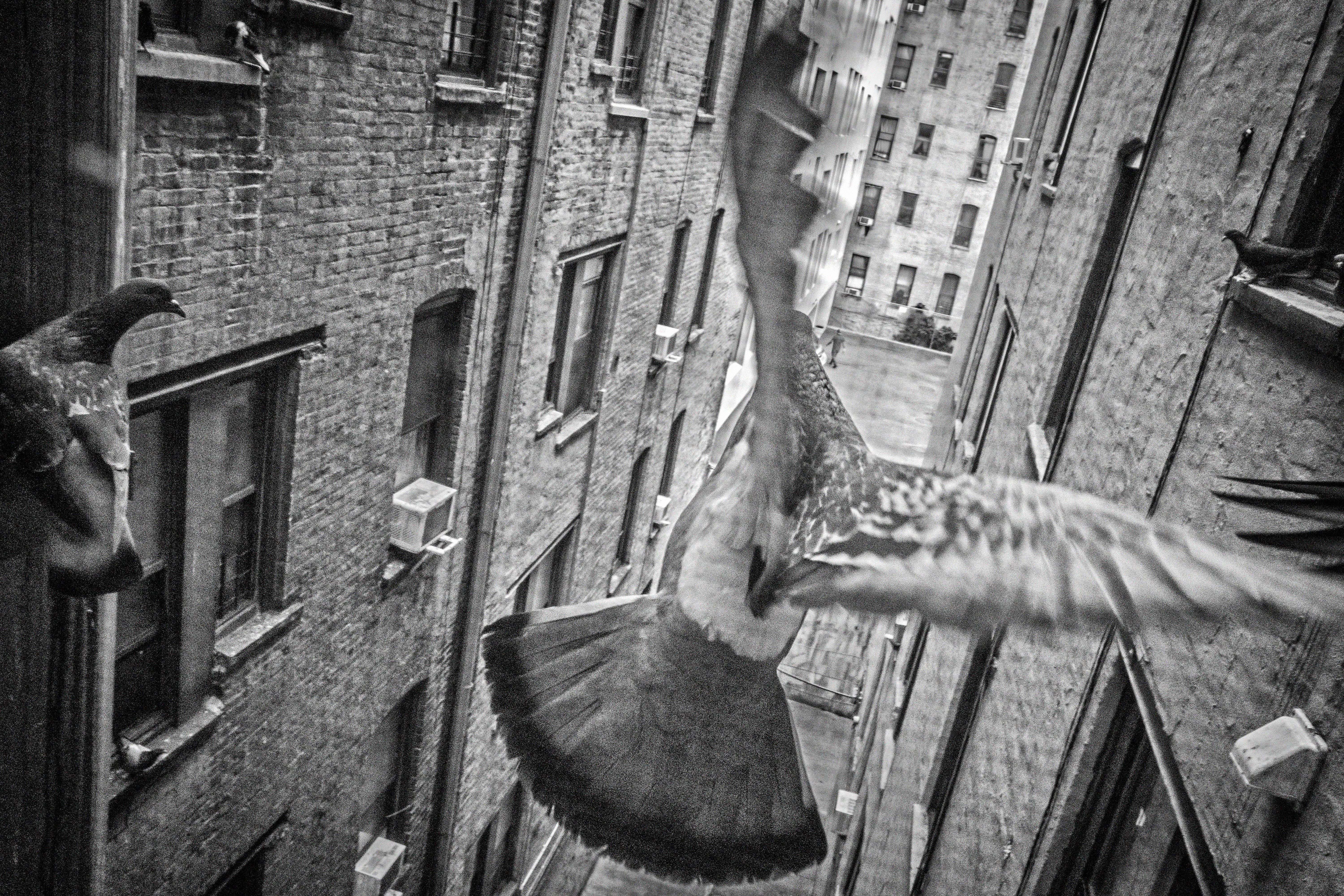 Within a few months, during the morning feeding time, as many as twenty-five pigeons would be flapping and landing in the alley, filling it with a fluttering chaos of feathers, soft wings brushing against one another, claws tapping on the windowsills, beaks pecking greedily at the scattered seed.