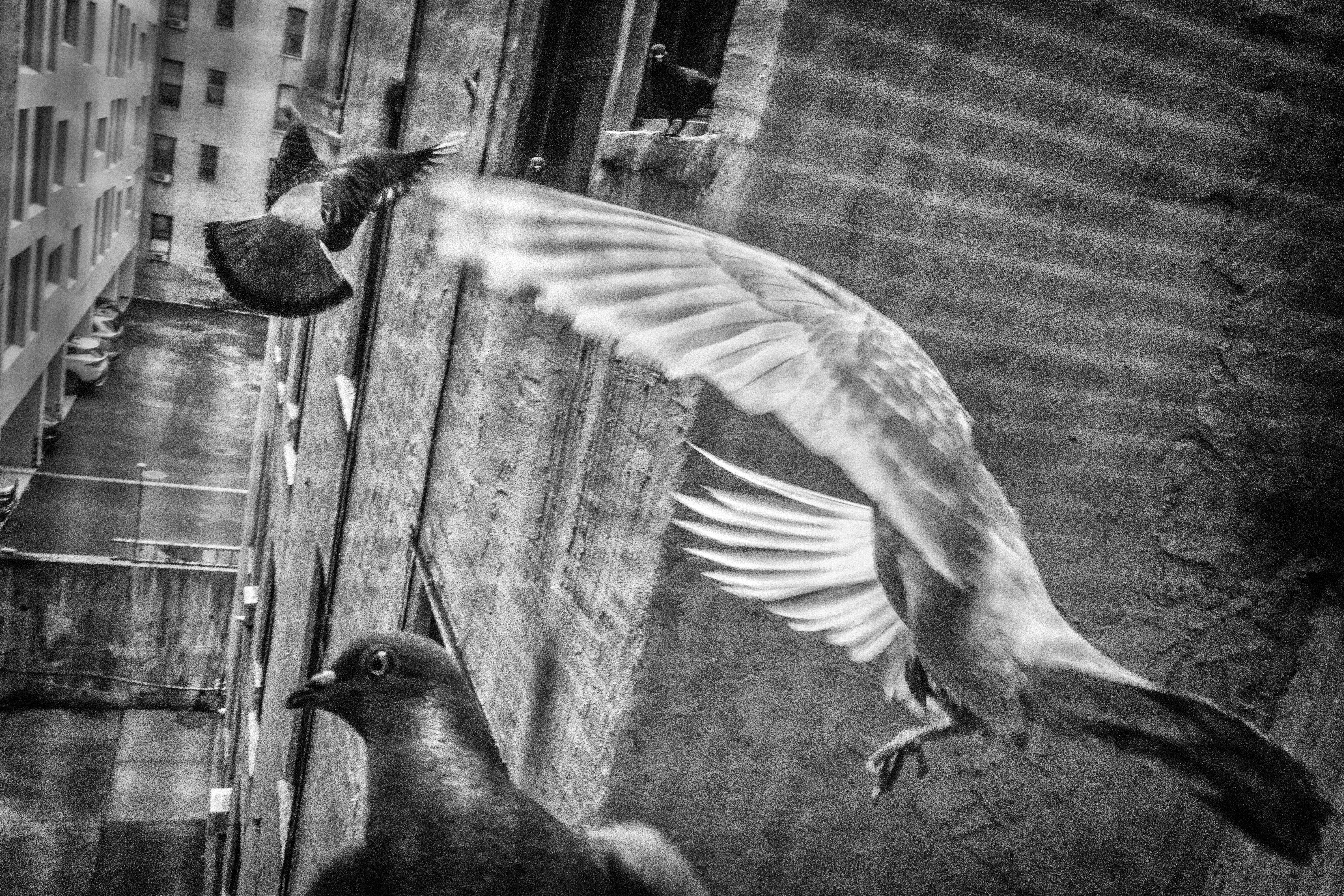 I don’t know exactly how pigeons communicate. Perhaps it’s through the low cooing sounds, or through a tilt of the head and a flick of the wing, or maybe by patterns invisible to me but obvious to them. What I do know is that word — or whatever the avian equivalent of word is — got out quickly. The two pigeons became four. Four became six. Within a few months, during the morning feeding time, as many as twenty-five pigeons would be flapping and landing in the alley, filling it with a fluttering chaos of feathers, soft wings brushing against one another, claws tapping on the windowsills, beaks pecking greedily at the scattered seed.