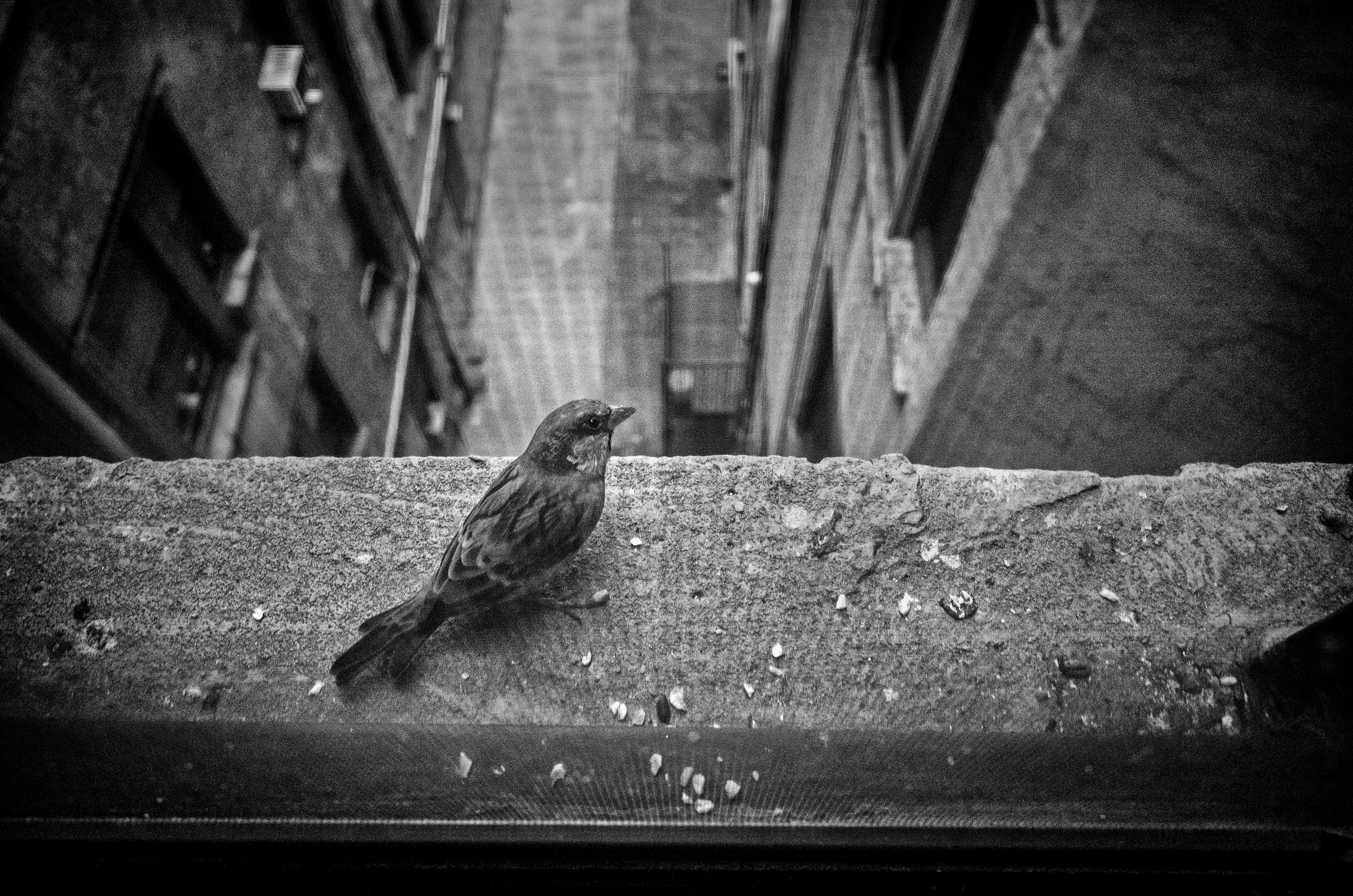 From my desk, which sits catty-corner to the kitchen window, I had a perfect view of all this. My work — whatever it was on any given day — faded into the background as I found myself watching them more and more. My screen would dim, emails would go unanswered, and the pigeons would hold my attention. It wasn’t just the pigeons, either. A pair of sparrows soon appeared, tiny against the bulkier birds. They had made their nest just outside the kitchen window, slipping in and out with the nervous, darting energy of smaller creatures. Unlike the pigeons, they weren’t greedy. They didn’t arrive expecting to be fed, but instead waited until the larger birds had eaten their fill, quietly picking through the leftovers. I developed an immediate affection for them. The sparrows with their delicate frames, quick movements, and subtle colors, so easy to overlook in a city that often celebrates only the dramatic.