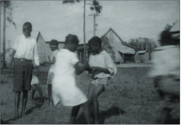 In contradistinction to a discourse of filmic realism, overexposure in Hurston’s films destabilizes the chain of association linking documentation, authenticity, and truth by simultaneously producing too much evidence and withholding other, expected knowledge. After all, the footage contains countless sustained close-ups of the body, and frames are often overloaded with gestic and historical referents: figures come in and out of focus; one scene depicts a group dance that abruptly zooms in to isolated movements of feet, while another reveals children with hands clasped, knees bent, and body weight evenly distributed spinning in circles until they dissolve into a blur (fig. 1).