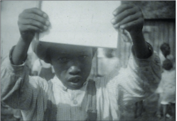 On one hand, Rony’s misclassification of the cards, a reading that persists among Hurston film scholars, is entirely understandable. The footage is old, it is often difficult to see, and as I noted above, Hurston was a filmmaker who, whether intentionally or not, frequently over- and underexposed her film. The cards’ illegibility is also due to the internal limits of early film technology. Because white objects reflect more light than black ones, and thus require less exposure time, and since cinematic technologies from aperture settings to film stock were calibrated to take the white face or object as its focal point, balancing blacks and whites in a single frame posed a formidable challenge for early filmmakers.19 Indeed, under the intensity of glaring sun-rays and against the brown of the young boy’s skin, the white paper repels the natural light, endowing the standard prop with a nearly fluorescent glow that at once enraptures us, but also makes it nearly impossible to decipher its inscription. In the most technical sense of the term, the white card is undeniably overexposed.