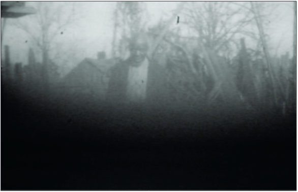 Despite these straightforward narrative cues, Kossula contains a number of technical missteps that inadvertently point to the aesthetic and practical limitations of rendering a narrative of black survival within the generic bounds of cinematic realism. Three minutes into the five-minute film, an object (perhaps Hurston’s finger) covers half of the lens, for nearly thirty seconds. During this time, the top of Kossula’s body fades in and out of focus, the bottom half is obscured, and eventually nothing but rustling treetops is visible. When his entire body does come back into view near the four-minute mark, it is clear that Kossula has finished this story: he stands up, stops speaking, and circles back to his porch. In a move that would seem to mark a transition into the next segment, Kossula looks at the camera, takes off his hat, and gestures to viewers to follow him indoors. At this moment, the scene begins to fade out, as a glow of light gray and then white washes the screen for a full minute. Thus, the film culminates in this oversaturation of light, producing a bathetic effect that renders both Kossula and his narrative illegible. As a technical “error,” this protracted moment of overexposure disrupts narrative cohesion and closure. Conceptually, however, the overexposure in Kossula reflects cinema’s inability to provide the representational frame with which to reconstruct Kossula’s African past. Constitutive of the film’s fragmentary and jarring amalgam of genres, techniques, and visual cues, overexposure betrays cinema’s own promise to synchronize sight, sound, and motion in order to represent black life. That is, even when overexposure amounts to a technical “failure,” it is ultimately an epistemologically productive one in that it calls into question cinema’s fitness to capture and convey a “true” account of enslavement (fig. 3).