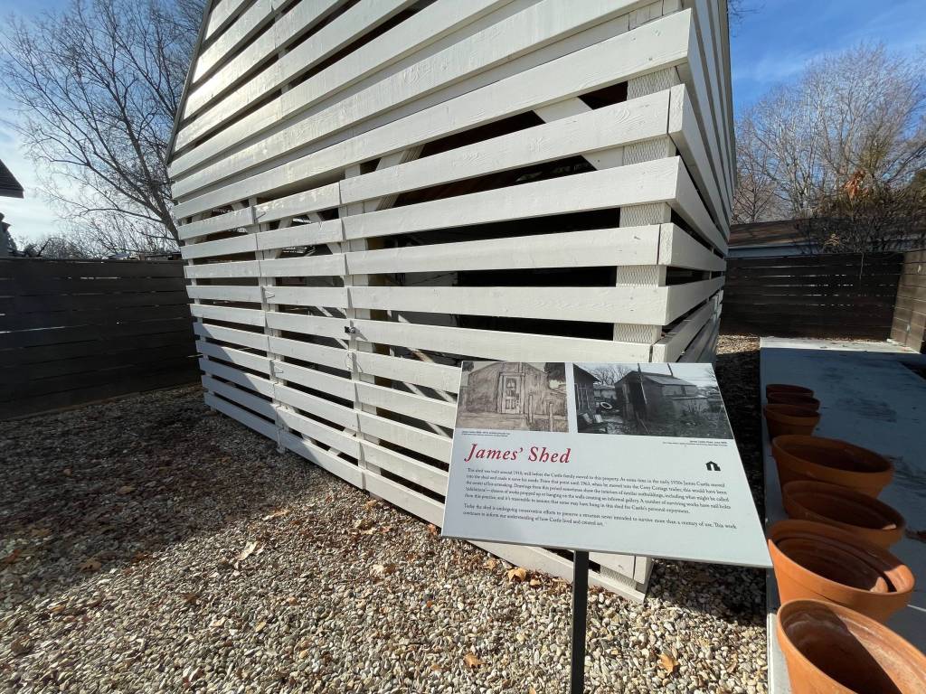 Behind the house is James’ shed, which is currently hidden beneath a protective structure while it undergoes preservation. Though a lot of the shed remains intact, it’s 100 years old and kind of falling apart and is not yet open to the public for viewing.