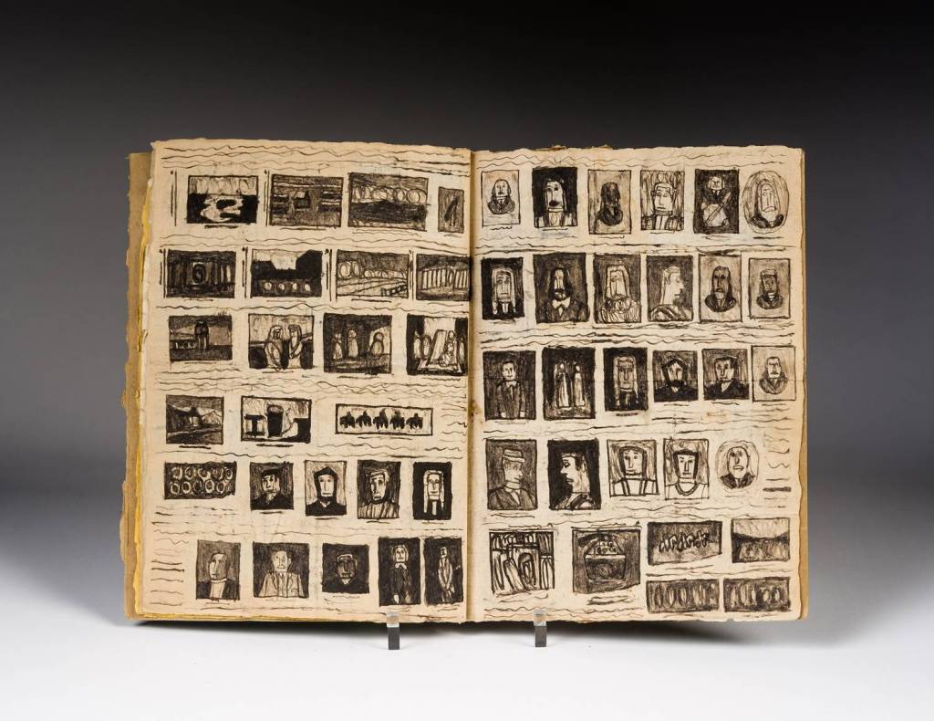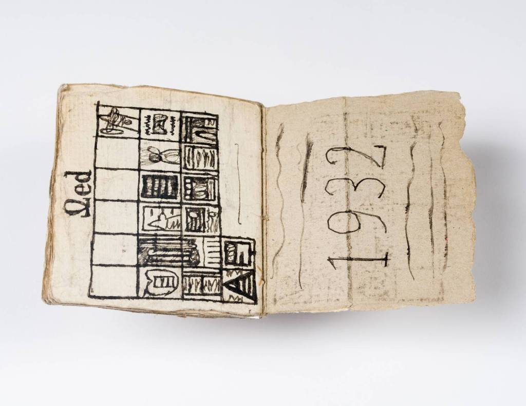 “The bookmaking probably came from his time at the Gooding School. The school was originally located in Boise but had burned down before Castle became a student. So when it was moved to Gooding, the teachers and students had to make their own books and materials,” explained Dunstan. “It was something he liked to do and just kept that practice going … He would sometimes transcribe other work that he found.” Like the small book on display at the James Castle House, filled with different sketches of an advertisement for a scotch whiskey.
