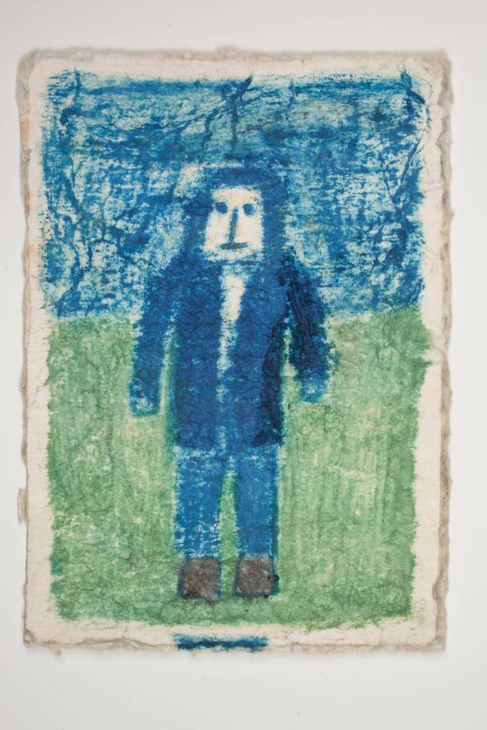 “Castle would take materials, typically food packaging, and get it damp then rough up the waxy surface. A lot of times he would use ice cream cartons as his chosen substrate. The family really loved vanilla ice cream, as that is often what’s on the other side of his work,” laughed Dunstan. “Castle would then take a variety of highly pigmented papers, sometimes crayons, sometimes colored pencils, sometimes unusual household products like laundry bluing, and use that actually press that color into the paper. They have this really soft, dreamy quality to them.”