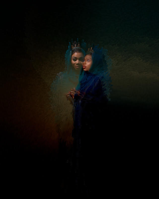 The first photo before us, simply titled “Portraits of Many Selves”, is a slightly pixelated photo shrouded in tones of blue, maroon, and brown. The central image is the female figure covered with a layer of blur (due to the not-fully washed pixels); she’s in a sort of blue gown, along with a blue hijab that covers most of her head except her face. Beneath the hijab, yet visible from the front, is a queen’s crown. Her eyes are gazing directly upwards towards a place beyond the frame, and her entire profile is beatific, as if she is enacting a ceremony among angels and spirits.