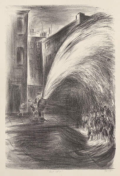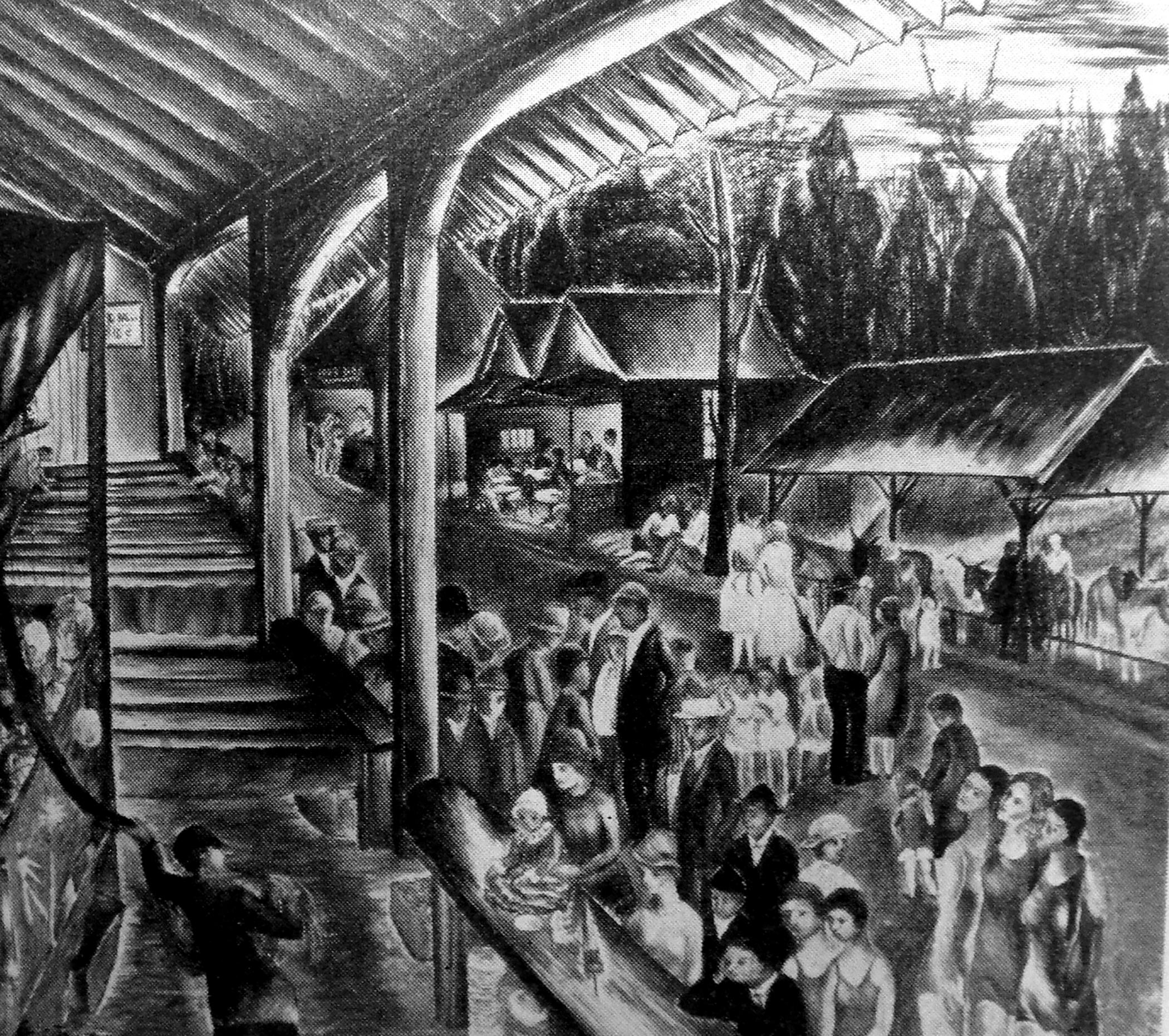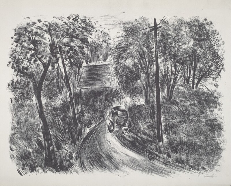 Tamotsu achieved his first public recognition by participating in shows produced by the Society of Independent Artists. At their 1927 show he presented “Bathers,” a crowded scene set in the steam room of a women’s Turkish bath. Two years later, he exhibited “Midway Scene,” a circus painting that brought approving notice from Christian Science Monitor critic Ralph Flint. In 1931 he contributed “Road Paving,” a work whose satiric nature was lauded by New York Times critic Edward Alden Jewell.