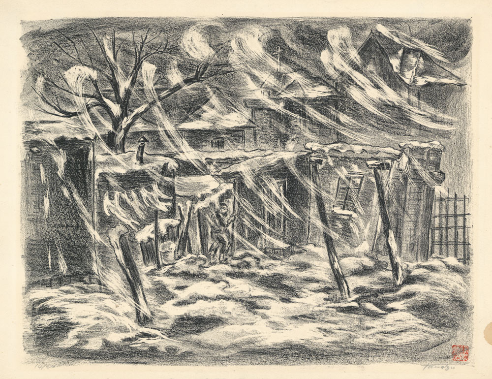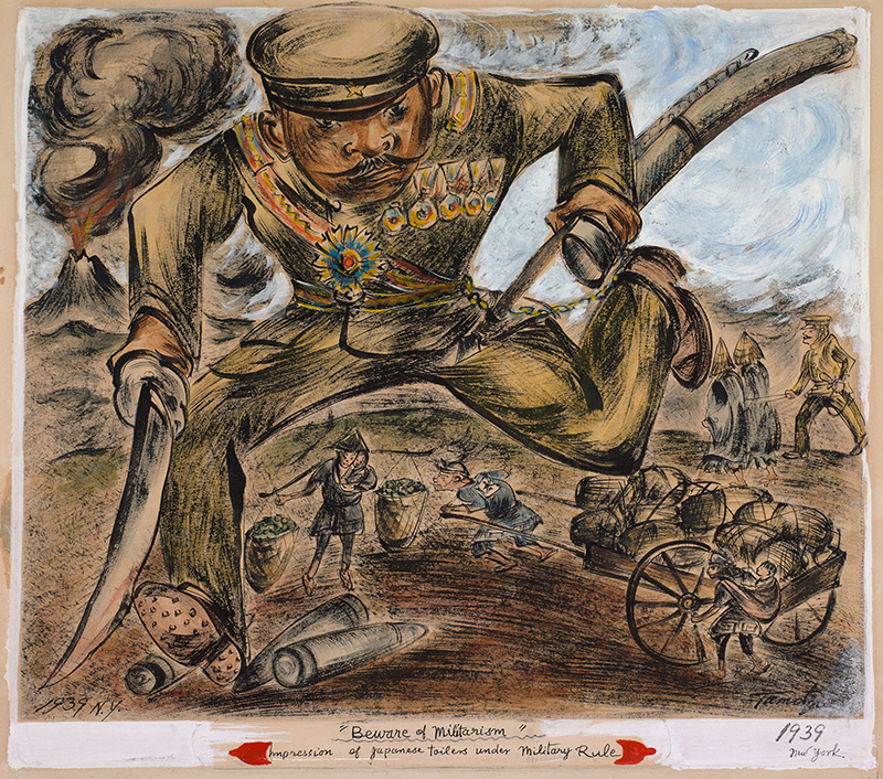 In fact, Tamotsu’s dismissal may not have been unrelated to his political activism, which continued through the 1930s. In January 1933, he contributed to put on a show by the John Reed Club, the Communist Party’s cultural wing. Tamotsu’s painting, entitled “Force of the Masses,” was a panoramic image of the Bonus Army (the World War I veterans whom Tamotsu’s friend Eitaro Ishigaki would also depict in his art). In mid-1937 he produced a Spanish Civil War landscape that was displayed at a show on Spain at Delphic Studios. That same year, in the wake of the Japanese invasion of China, Tamotsu invited Chinese artists to join the annual show of Japanese painters in which he participated at the A.C.A. Gallery in New York. In 1940, Tamotsu donated a painting for sale to raise money for the American Rescue Ship Mission, which helped transport political refugees to the United States. In March 1941 he joined in another benefit, the Art For China, to aid Chinese war orphans. Columnist Leonard Lyons quoted Tamotsu as saying that his art was “One small way to express my love for peace and hatred for war … is to do what I can for any victims of aggression, wherever they may be.”