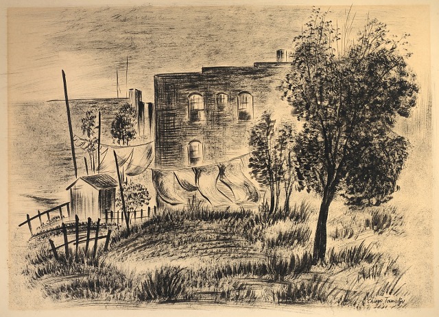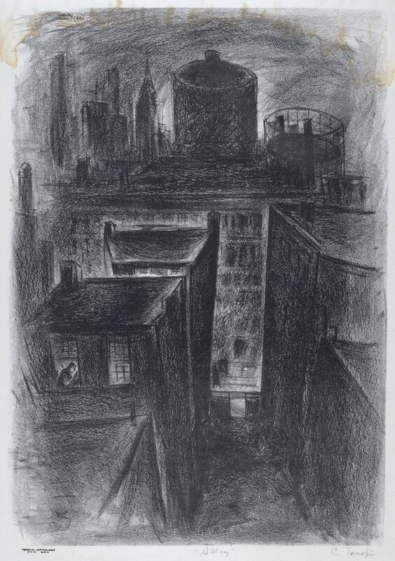 Sometime in the mid-1930s, Tamotsu was recruited by Juliana Force, curator of the Whitney Museum of American Art, to work on the Federal Arts Project, part of the New Deal-era Works Progress Administration. He was engaged both on the Easel Project and also on the Graphic Art Project. One highlight of his tenure came in 1936 when Tamotsu displayed some drawings in a show at the WPA Federal Art Project Gallery that was viewed by more than 60,000 visitors. Nonetheless, soon afterward WPA directors fired Tamotsu and his Issei colleagues from the Project on the (rather specious) grounds that they were not U.S. citizens.