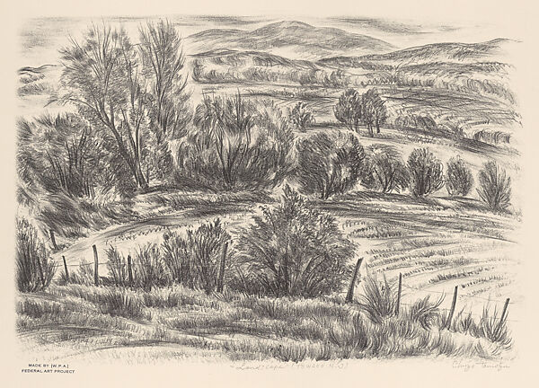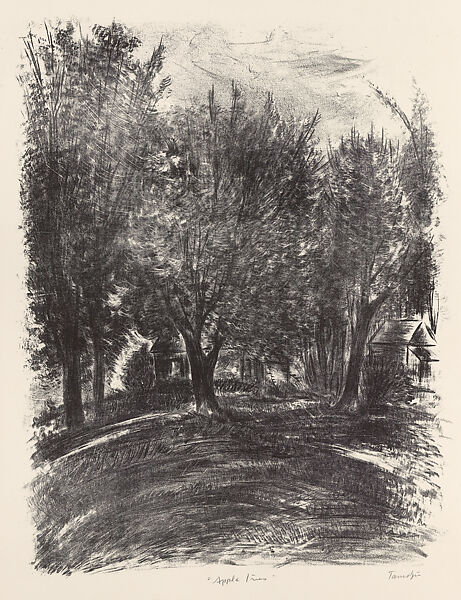 Tamotsu soon sought further venues for his art. In December 1929, he displayed five paintings in a show at the Opportunity Gallery, which had become well known for exhibiting modern American art. Carlyle Burrows, writing in the New York Herald Tribune, acknowledged the influence of Kuniyoshi on Tamotsu’s art, but praised its qualities: “His landscape with donkeys is unusual both in concept and color; his “Down Hill,” a Hudson River village subject, is crisp and authentic.” In 1931, Tamotsu joined another show at the Opportunity Gallery, for which he produced the colorfully-named painting, “Landscape with Chickens.” That same year, Tamotsu joined a show of four artists at the G.R.D. Studio. Critic C.B., writing in the New York Herald Tribune, described Tamotsu as “given to painting somber little landscape scenes in the occidental manner, which are well equipped with personality.” In 1936 he participated in a show held at the temporary galleries of New York’s Municipal Art Committee. Tamotsu showed “Peace Valley,” which New York Times critic Howard Devree praised as “a study in shades of green.”