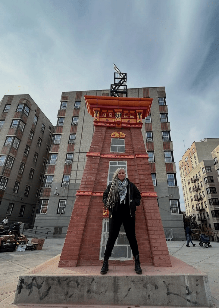 Shellyne Rodriguez’s Phoenix Ladder: Monument to the People of the Bronx (2025), located on Grand Concourse and Morris Avenue in the Bronx, is an example of what a contemporary monument can stand for. The public sculpture is a fitting tribute to the vibrant character of the neighborhood and its resilient population. Rendered in terracotta, brick and steel, the monument resembles a traditional multi-story apartment building, but is distinctly rendered as a pyramid, with ornate facade featuring the letters “B” and “X,” which is the abbreviation for the borough; as well as a graphics of a phoenix, Black power fists and eyes, each surrounded by fanciful flames. Rodriguez has included a fire escape type of ladder at the top of the structure, perhaps as a Jacob’s ladder type of allegory for the spirit and strength that residents are known for, which has enabled them to triumph over systemic duress and bias.