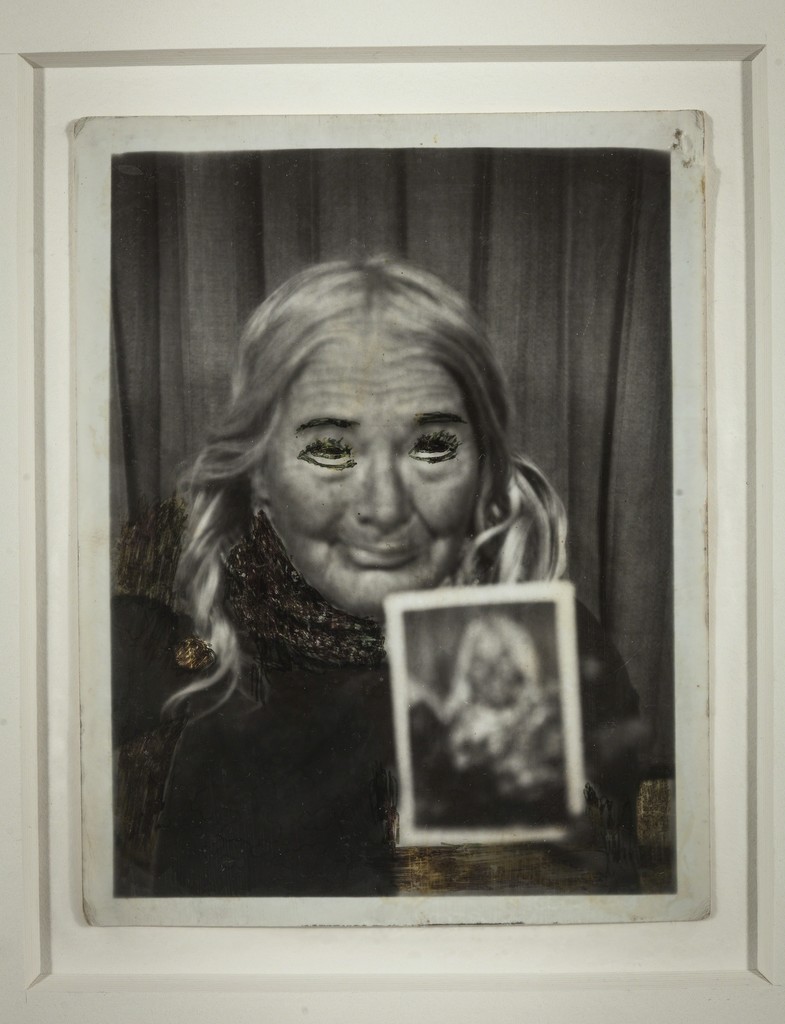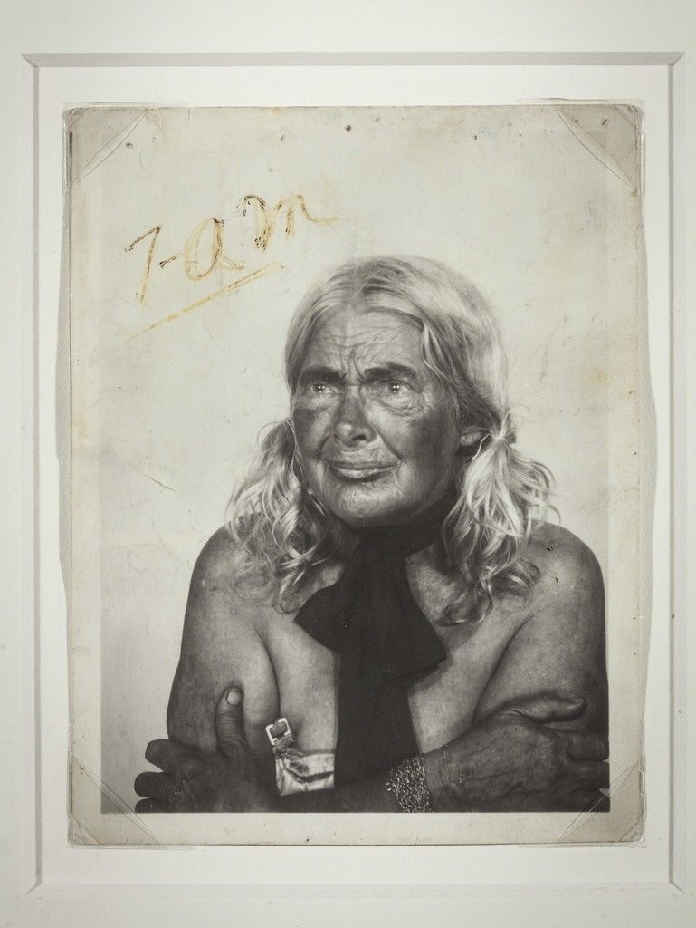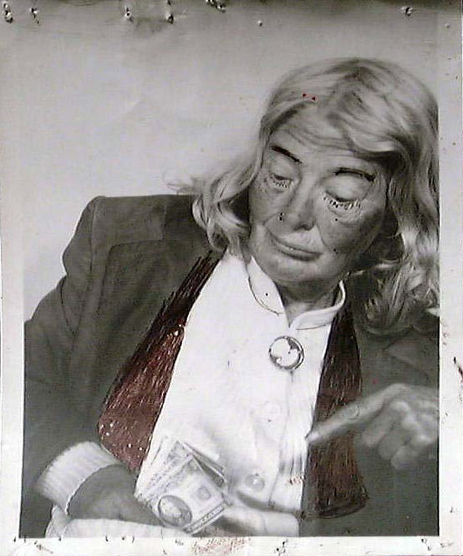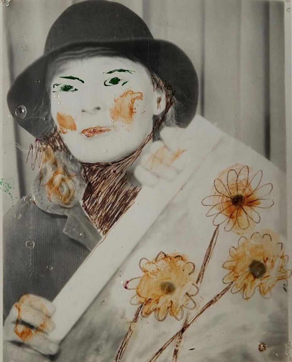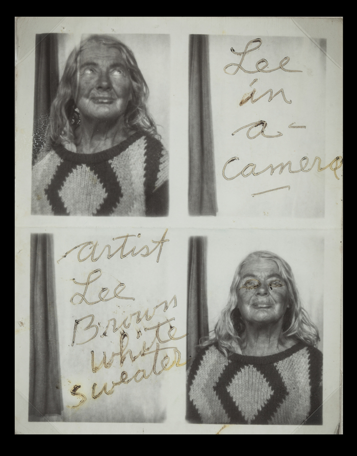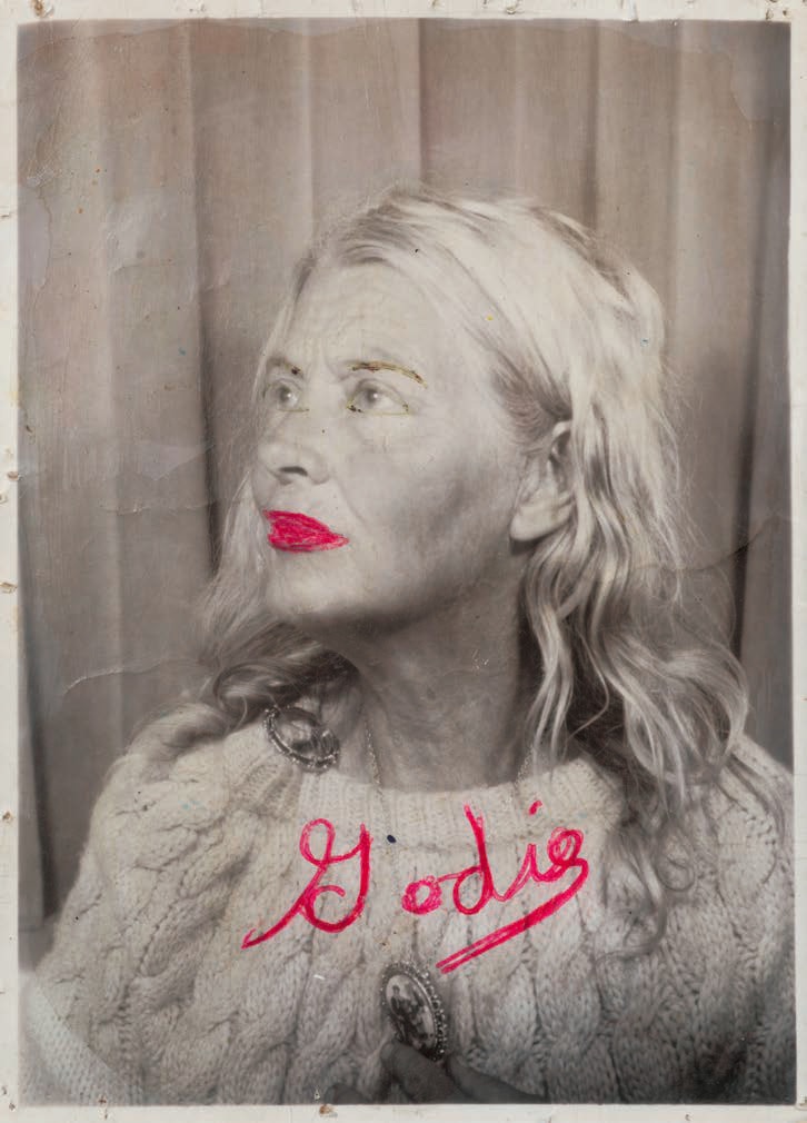 Her most fascinating work, to me, is her collection of bus station photo booth self-portraits. This is where she really cultivated her image of herself, and they’re playful and strange and beautiful and sad and strong. She would pose and preen and dress up, and then she would paint or write on the images after they were printed. Adding her name and her title, Lee Godie, French Impressionist. She would hide from the camera for some of the frames in a series, quite literally playing with the space between the images, the silence between the words. She’s often looking to the side, but sometimes she’s looking straight at the camera, straight at the viewer, and the photos are powerful and haunting.