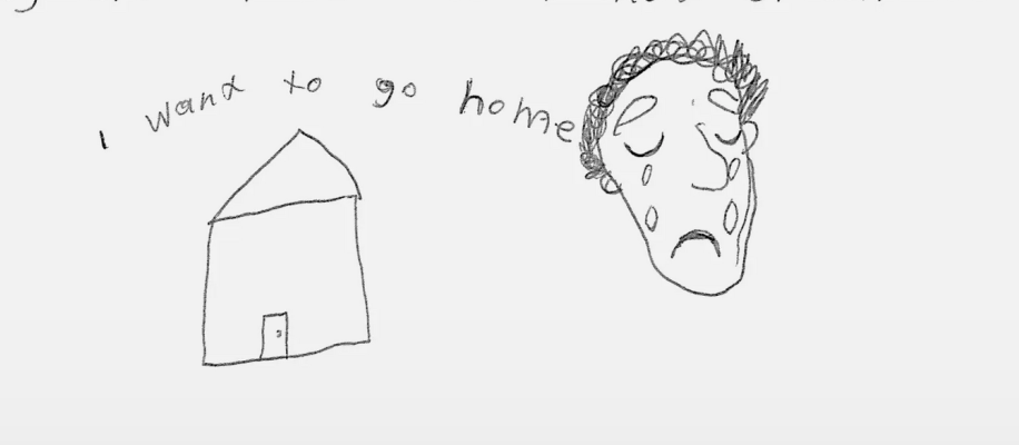 Looking at these drawings, you would have to be absolutely callous not to empathize with the children who made them. Thirteen-year-old Gerson Lopéz Garcia’s drawing is stark and to the point. On plain white letter paper, Garcia drew a simple icon representing a house. The house has a door, but no windows. On the right-hand side of the house is a grief-stricken head, with two large oval shaped tear drops descending from its eyes on each side of the face. Text above the drawing explains that: “We are all stuck in rooms that can hold twelve people they won’t let us go out to the playgrounds and park and it’s very boring to do every day God touch the hearts of those at ICE let us out We are not criminals I want to go home.”